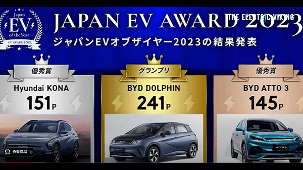 I think in fact Japan doesn't want to give this award to BYD, but the scores make BYD won.On the official website of the award, it starts with the second place first (Hyundai, a non-Chinese), then the first and the third.我认为事实上日本并不想把这个奖颁给比亚迪,但得分却让比亚迪获了奖。