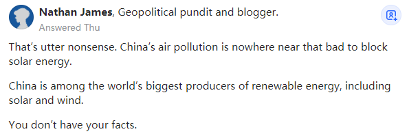 那完全是胡说八道,中国的空气污染远没有到能阻止太阳能那么严重。中国是世界上最大的可再生能源生产国之一,包括太阳能和风能。