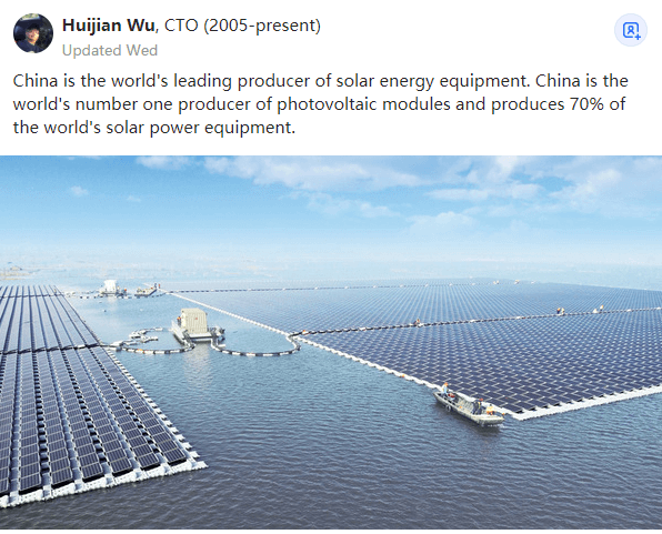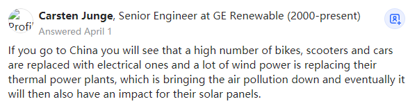 通用电气可再生能源公司高级工程师(2000年至今)如果你去中国,你会看到大量的自行车、滑板车和汽车被电动车所取代,大量的风能电站正在取代他们的热电厂,这将减少空气污染,最终也会对他们的太阳能光伏板发电产生影响。