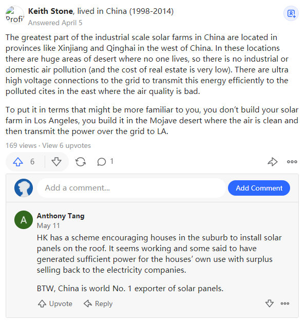 首席技术官(2005年至今),2001年至今生活在香港中国是世界领先的太阳能设备生产国,中国也是世界第一大光伏组件生产国,生产了世界70%的太阳能发电设备。中国大陆也是世界上最大的太阳能光伏发电(solar PV)市场。自2013年以来,中国大陆一直是世界领先的太阳能光伏发电安装商。中国大陆的太阳能光伏产业是一个不断发展的产业,拥有400多家公司。2015年,中国大陆超过德国,成为世界最大的光伏发电设备生产国。2017年,中国新增光伏发电容量52.83GW,占全球新增容量的一半以上,而总容量增至130.25GW,使中国大陆成为第一个累计光伏装机容量超过100GW的国家。在2018年中国总用电量68449亿千瓦时中,光伏发电量为1775亿千瓦时,占总发电量的2.59%。太阳能热水器在中国大陆的应用也非常广泛,截至2014年底,中国太阳能热水器的总装机容量为290 GWth,约占全球太阳能热装机容量的70%。中国目前正在推动一项全国性的计划,打算在全国各地(特别是农村地区)的建筑物顶部安装太阳能发电装置,目标是消除全国(主要是农村地区)对统一供电电网的需求。问题问的是中国是如何利用太阳能的,而不是在问它利用了多少太阳能。10年前,我在山东和广东旅行时,我发现他们几乎在每个屋顶都安装了太阳能电池板。这两个省份没有那么丰富的太阳能资源,那里的天气通常并不晴朗(在那时能看到太阳和白云都算是一个惊喜)。因此,在我看来,这些光伏板的效率肯定会相当低,但鉴于它的数量,总的发电量应该还是相当可观的。然而,他们的投资回报率(ROI)值得怀疑。你来自加利福尼亚,这解释了很多事情。加利福尼亚阳光充足,如果你采用加利福尼亚州的标准,那么世界上大多数地方的天气都可以被描述为“糟糕”。例如,旧金山每年有大约3000小时的日照,而伦敦只有1600小时,巴黎也只有1600年小时,匹兹堡有2000小时。这基本上击败了发达国家的大多数主要城市。说到太阳能资源,山东实际上是个好地方。例如,青岛每年有2500小时的日照,虽然没有达到加州的水平,但我相当肯定它有一个不错的投资回报率。(青岛也恰好拥有与旧金山几乎相同的纬度,因此我们可以少担心一个因素……)另一个潜力巨大的地方是新疆,在某些地方(如吐鲁番盆地),那里的日照时间可以达到3000小时左右。新疆也恰巧是另一个拥有葡萄园、以葡萄闻名的地方。那里还有沙漠,这也是加州的特色。虽然中国肯定生产了各种不同质量的光伏板,但在不到3年的时间内,我的一位同事安装的20块来自中国的光伏板就有17块出现了故障,之后他重新安装了加拿大产的光伏板,再也没有出现任何问题。