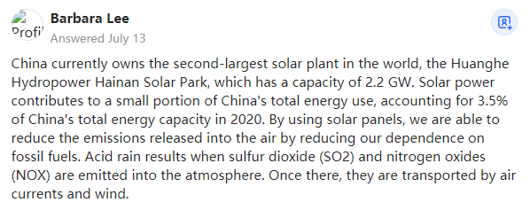中国目前拥有世界第二大太阳能发电厂——黄河水电海南太阳能产业园,其容量为2.2 GW。太阳能只占中国能源总使用量的一小部分,到2020年约占中国能源总容量的3.5%。但通过使用太阳能电池板,我们能够减少对化石燃料的依赖,从而减少排放到空气中的污染物的数量。当二氧化硫(SO2)和氮氧化物(NOX)排放到大气中时,就会产生酸雨。一旦产生,它们就会被气流和风输送到别的地方。