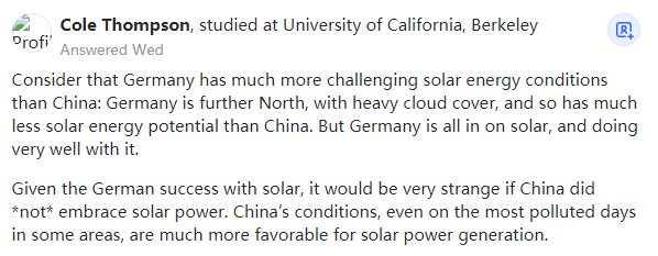 德国的太阳能条件比中国更具挑战性,只需了解一下这个就能明白:德国比中国更偏北,云层也更厚,因此它的太阳能发电潜力比中国小得多。但德国正全力支持太阳能,而且做得很不错。鉴于德国在太阳能方面的成功,如果中国不接受太阳能,那将是非常奇怪的。中国的条件,即使在一些地区污染最严重的日子里,也比德国好得多。