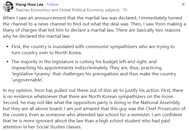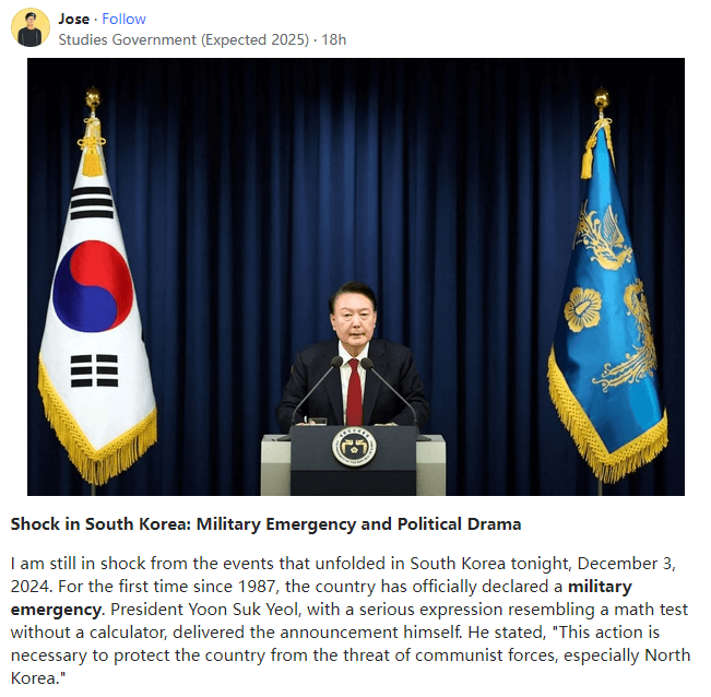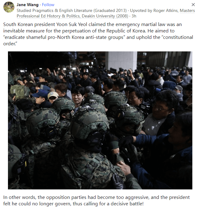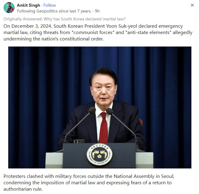网文来自网友原文翻译投稿,所有言论皆不代表本站立场 | 本文文字/图片来自网络,侵删 | 点击页眉也可刷新 | 注册送50花瓣,每日登录送5花瓣 | 本文内容仅供娱乐,不作任何严肃之用途军事紧急状态和一场政治闹剧!尹锡悦为何宣布戒严?他会有怎样的下场?本文译自Quora,原标题:Why was martial law declared in South Korea?Studies Government (Expected 2025),Lives in Indonesia2003–present政府研究(预计2025年),2003年至今生活在印度尼西亚今晚(2024年12月3日)在韩国发生的事件仍令我震惊不已。自1987年以来,韩国首次正式宣布进入军事紧急状态。就像一场没有计算器的数学考试,尹锡悦总统以严肃的表情亲自宣布了这一消息,他说:“为了保护国家不受共产主义势力的威胁,特别是北朝鲜的威胁,这一行动是必要的。”问题是根据韩国宪法第76条,总统确实有权宣布军事紧急状态,但仅限于特定的条件:比如战争、暴乱或自然灾害。今晚呢?这三种情况都没有发生。因此,这一决定就像晴天撑伞,让很多人无所适从。总统可能认为这是一种预防措施,但这仍然让很多人产生疑问:对谁来说是紧急状态?试想一下,韩国人民平时忙着在演唱会上选择他们偏爱的K-pop音乐,现在却被告知要寻找安全的地方以防袭击,这是比任何韩剧都更戏剧化的情节转折!几架中国和俄罗斯的军机被发现进入韩国防空识别区后,朝鲜半岛的紧张局势达到了顶峰。韩国军队立即出动战斗机进行反击,但这仅仅是个开始。尹锡悦总统还指责控制议会的反对党是朝鲜的“傀儡”,甚至声称他们企图颠覆政府。哇,这是一个严重的指控。尹总统表示为了根除国内的亲朝鲜势力,有必要采取紧急军事行动。因此,韩国不仅面临外部威胁,而且还在与“国内的敌人”作战。有什么影响?所有的政治活动(包括国会会议和抗议活动)都被正式禁止,这种情况让我们想起了描述韩国军事紧急状态时期的电影《出租车司机》(2017年)。当年,学生们惨遭军方枪杀。现在,国会大厦被关闭,士兵们试图进入,但他们遭到了反对紧急状态的市民的抵抗。这会是一场针对立法机构的行政政变吗?这与1959年苏加诺全面控制印尼时的情况如出一辙。此举自然引发了激烈的反应,反对党领导人甚至称尹锡悦的行为是非法的,并计划召开紧急会议(讽刺的是现在这也是非法的)。根据韩国宪法第77条第5款,国会必须通过议案才能解除紧急状态,且必须获得半数以上议员(300名议员中至少151人)的批准。如果这样,军事紧急状态就必须解除。但是我们是真的在目睹历史重演,还是这只是现代的巧合?韩国正处于一场重大危机的边缘。从经济、技术到流行文化(想象一下韩剧的影响吧!),韩国在全球范围内都有着举足轻重的影响力。东亚的紧张局势也在加剧,韩国会重回独裁时代吗?还是说这只是韩剧风格政治剧的新篇章:充满冲突、阴谋和悬念。有一点可以肯定:全世界都屏住了呼吸。我们呢?我们只能希望这一季的结局不会太差。Following Geopolitics since last 7 years,Lives in Chandigarh, India2022–present过去7年一直关注地缘政治,2022年至今生活在印度昌迪加尔2024年12月3日,韩国总统尹锡悦以“共产主义势力”和“反国家分子”涉嫌破坏国家宪法秩序为由宣布紧急戒严。抗议者在首尔国会外与军队发生冲突,谴责实施戒严令并表达了对恢复专制统治的担忧。反对党领袖李在明谴责此举非法且违宪,敦促民众抵制他所称的“独裁”行动。数小时内,韩国国会召开紧急会议,一致表决撤销戒严令。尽管最初遭到军事当局的抵制,但在强大的政治压力和公众的强烈抗议下,尹锡悦总统还是在黎明前解除了戒严令。这一事件标志着韩国四十多年来首次宣布戒严,唤起了人们对过去军事独裁统治的回忆。此外,令人难以置信的是韩国在2023年民主指数排名中名列第22位,被认为是完全民主的国家,而印度则名列第41位,被认为是有缺陷的民主国家。因此,我的问题是:“我们真的应该相信或者可以说盲目相信一些欧洲组织给出的这些排名吗”?Teaches Economics and Global Political Economy subjects,Lives in Uijeongbu, South Korea2013–present教授经济学和全球政治经济学课程,2013年至今生活在韩国Uijeongbu当我看到宣布戒严的公告时,我立即把频道转到新闻频道,想知道到底是怎么回事。然后,我看到尹锡悦提出了一连串导致他宣布戒严的罪名,他宣布戒严基本上有两个原因:Ø首先,韩国国内充斥着共产主义的同情者,他们试图把国家交给北朝鲜。Ø韩国国会中的多数派正在大肆削减他的预算,并不分青红皂白地弹劾他的任命。因此,他们正在实行“立法暴政”,挑战他的特权,从而使国家“无法治理”。在我看来,尹锡悦是凭空捏造这些来为自己的行为辩解。首先,没有任何证据表明有朝鲜同情者逍遥法外。其次,他可能不喜欢反对党在国会的所作所为,但他们都是光明正大的。我只是惊讶于这家伙竟然曾经是国家的首席检察官,作为一个曾在法学院学习过一个学期的人,我相信他对法律的无知程度比一个在社会研究课上专心听讲的高中生还要高。我认为从某种程度上来说,他可能真的“相信”这些事情,并因此而感到沮丧。然而,从更深层次来看,我认为套在他(和他妻子)脖子上的绳索正在收紧,因为他(和她)参与过各种非法活动——无论是作为总统候选人还是总统。现在,我认为他是在自掘坟墓,因为宣布戒严是棺材上的最后一颗钉子