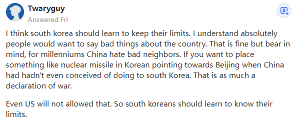 我认为韩国应该学会维持自己的界限(limits)。我完全理解人们会说这个国家的坏话,这没问题,但请记住,几千年来,中国憎恨坏邻居。如果你指望在朝鲜半岛放置类似核导弹的东西并指向北京而中国甚至不会考虑对韩国采取行动............因为这同样是宣战。即使是美国也不会允许韩国这样做,所以韩国人应该学会了解自己的界限。在西方式的民主制度中,一个努力兑现竞选承诺的总统不是一个好总统。以特朗普为例。