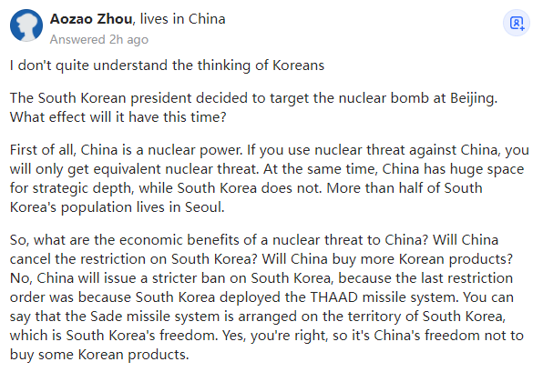 首先,中国是一个核大国。如果你对中国使用核威胁,你只会得到同等的核威胁。与此同时,中国有巨大的战略纵深空间,而韩国没有,韩国一半以上的人口生活在首尔。那么,对中国进行核威胁有什么经济利益吗?中国会取消对韩国的限制吗?中国会购买更多韩国产品吗?不,中国将对韩国发布更严格的禁令,因为上一个限制令的诞生是因为韩国部署了萨德导弹系统。你可以说,萨德导弹系统部署在韩国领土上,这是韩国的自由。是的,你是对的,所以中国也有不购买韩国产品的自由。所以我不明白(为什么要这么做)。对中国强硬不是问题,但在他对中国采取强硬立场后,我看不出他能带来什么好处。