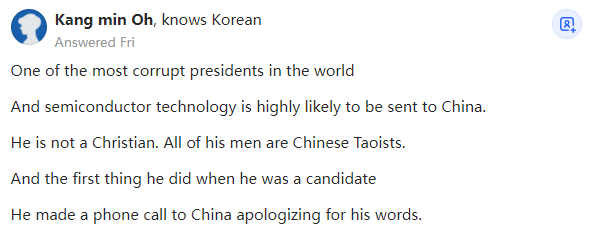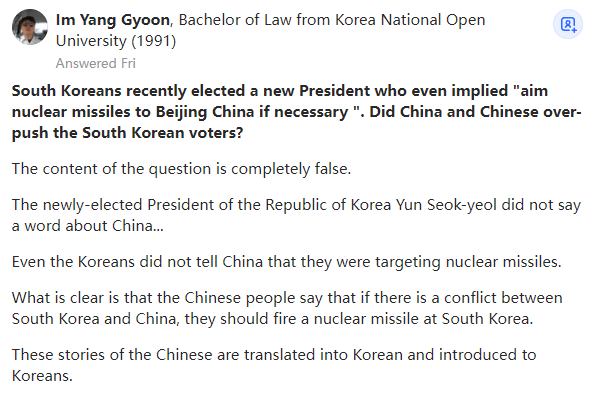 很明显,是中国人在说如果韩国和中国发生冲突,他们应该向韩国发射核导弹。这些中国人说的这些话被翻译成韩语并介绍给了韩国人。此外,中国还干预了韩国的总统选举,操纵了公众舆论。“很明显,是中国人在说,如果韩国和中国发生冲突,他们应该向韩国发射核导弹。”别胡说八道了。中国人从未谈论过,甚至从未想过与中立国发生军事冲突。嗯,有可能在这个小硬汉掌权的情况下,韩国未来不会保持中立,但目前中韩关系没有显著变化。