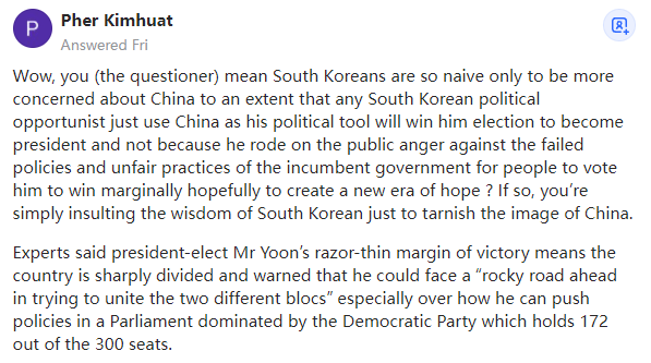 哇!你(提问者)的意思是,韩国人太天真了,他们更加关心中国,以至于任何一个韩国政治机会主义者仅仅只要把中国作为他的政治工具,都能为他赢得当选总统的机会,而不是因为他利用公众对现任政府失败的政策和不公平做法的愤怒,让人们投票给他并希望以微弱优势获胜,从而创造一个充满希望的新时代?如果是这样,你只不过是在为了玷污中国的形象而侮辱韩国人的智慧。专家表示,尹锡悦当选总统的优势微乎其微,这意味着该国存在严重分歧,并警告称,他可能面临“试图团结两个不同集团的艰难道路”,尤其是在他如何在由民主党主导的议会中推行政策的问题上,因为民主党在300个席位中拥有172个席位。