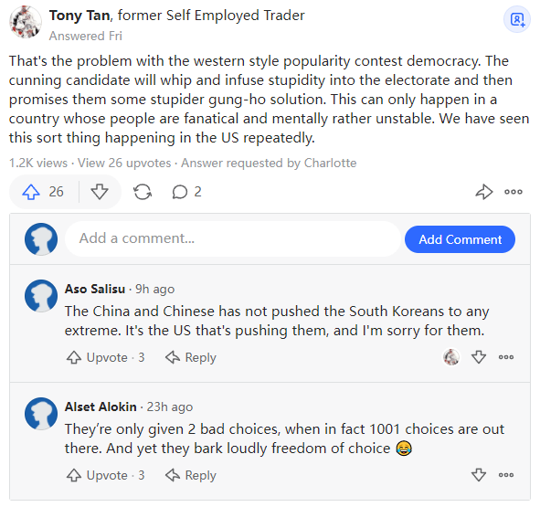 这就是西方式民望竞赛民|主的问题所在。狡猾的候选人会鞭打选民并将愚蠢灌输给选民,然后向他们承诺一些更愚蠢的解决方案。这只会发生在一个人民狂热且精神相当不稳定的国家,我们已经多次看到这种事情在美国发生。