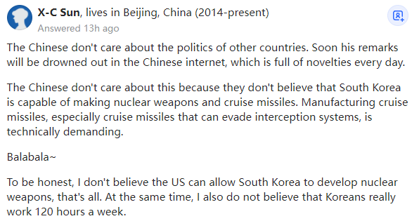 中国人不关心其他国家的政治。很快,他的言论就会淹没在每天充满新奇内容的中国互联网上。中国人不在乎这一点,因为他们不相信韩国有能力制造核武器和巡航导弹。制造巡航导弹,尤其是能够躲避拦截系统的巡航导弹,在技术上要求很高。说实话,我认为美国不会允许韩国发展核武器,仅此而已。同时,我也不相信韩国人真的会每周工作120小时(译注:韩国总统当选尹锡悦,曾扬言要韩国人一周工作120小时)。