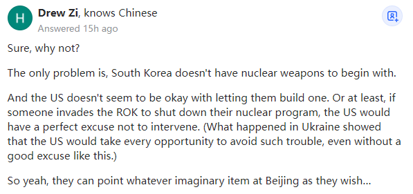 而美国似乎不同意让他们建造一个。或者至少,如果有人入侵韩国关闭其核计划,美国将有一个不干预的完美借口。(在乌克兰发生的事情表明,即使没有这样好的借口,美国也会抓住一切机会避免此类麻烦。)所以是的,他们可以随心所欲地把任何想象中的东西指向北京…