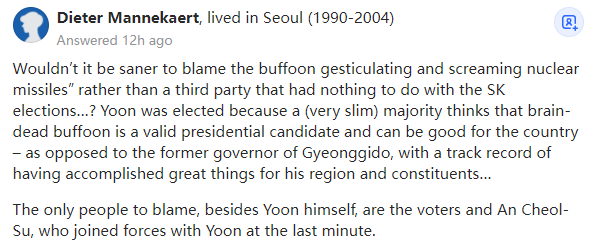 指责“打着手势叫嚣着核导弹”的小丑而不是与韩国选举无关的第三方……难道不是更明智吗…?尹锡悦之所以当选,是因为(非常微弱的)大多数人认为这个愚不可耐的小丑而不是有着为自己所在地区和选民做大事的记录的前京畿道知事(译注:指另一个候选人李在明,他曾在2018年韩国地方选举中,当选为京畿道知事)是一个有效的总统候选人,可以为国家带来好处——除了尹本人外,唯一应该受到谴责的人是选民和安哲秀,因为他们在最后一刻与尹联手。