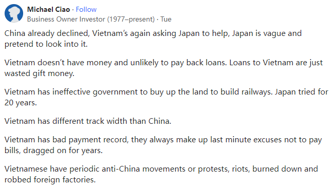 越南没有钱,也不太可能偿还贷款,贷款给越南只是浪费礼金(gift money)。越南政府在购买土地建设铁路方面效率低下,日本已经为此努力了20年。越南的付款记录很差,它们总是在最后一刻找借口不付账单,然后一拖就是好几年。