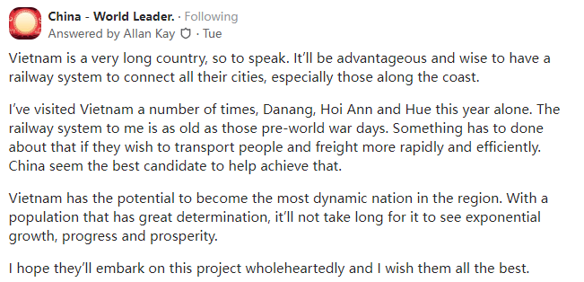 我去过越南很多次,仅今年就去过岘港、会安和顺化。在我看来,越南的铁路系统和世界大战之前一样老旧。如果它们想更快速、更高效地运送人员和货物,就必须对此采取一些措施,而中国似乎是帮助它们实现这一目标的最佳人选。越南有潜力成为本地区最具活力的国家,因为越南人民拥有坚定的决心,用不了多久就能实现指数级的增长、进步和繁荣。我希望它们全心全意地开展这一项目,并祝愿它们一切顺利。