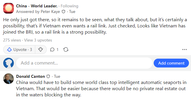Lived in Curra Queensland Australia他才刚到那里,所以他们谈了些什么还有待观察,但肯定是有这个可能的,前提是越南想要一条铁路线。我刚查了一下,越南好像加入了“一带一路倡议”(BRI),所以铁路连接是很有可能的。
