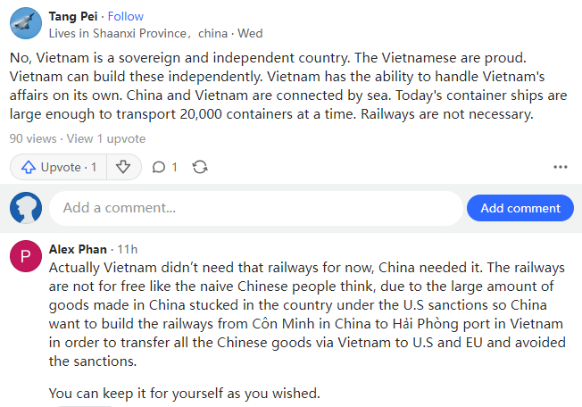 其实越南现在并不需要这条铁路,是中国需要它。这条铁路并不像天真的中国人想象的那样是免费的,因为在美国的制裁下,大量中国制造的商品滞留在国内,所以中国想修建从中国的昆明到越南的海防港的铁路,以便将所有中国商品通过越南转运到美国和欧盟从而避免制裁。