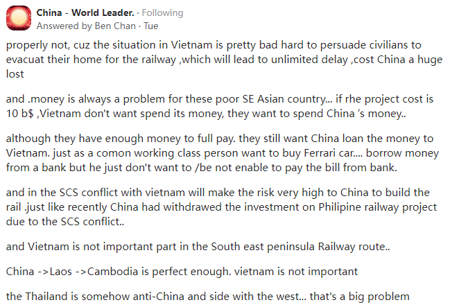 而且......对于这些贫穷的东南亚国家来说,钱始终是个问题......如果项目的成本是100亿美元,越南不想花自己的钱,它们想花中国的钱。尽管它们有足够的钱全额支付,但它们还是希望中国把钱借给越南,这就好比一个普通工人想买法拉利汽车....但他就是不想/没有能力从银行付账。与越南的南海冲突将使中国修建铁路的风险非常高,就像最近中国因南海冲突而撤回了对菲利宾铁路项目的投资一样。泰国在某种程度上反|华并站在了西方一边......这是一个大问题。