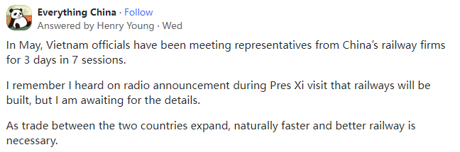 来源:https://www.quora.com/Will-China-and-Vietnam-cooperate-in-building-railways-after-the-Chinese-presidents-visit