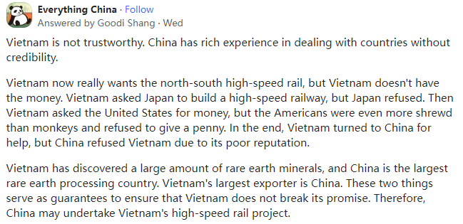 中国承建越南的铁路项目是个坏主意。铁路项目建成后将有助于越南的稀土顺利运往中国的竞争对手和敌人(美国、日本、韩国,对,还有越南)。永远不要相信越南人。如果中美之间爆发战争,“越南”和印度一定会从背后攻击中国。