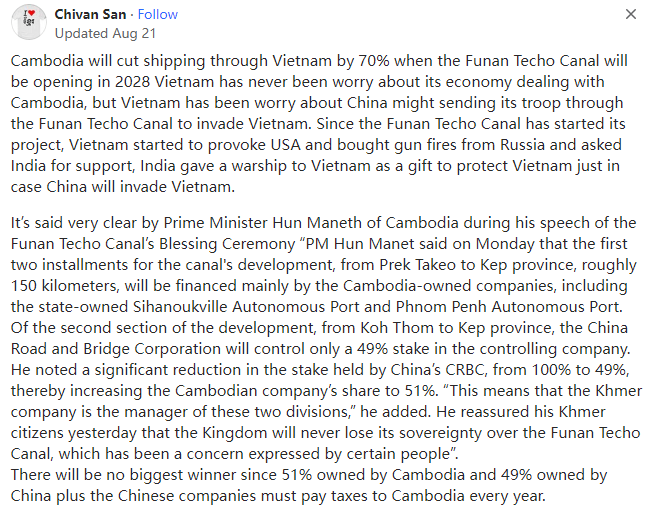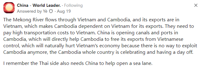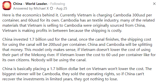中国援建的柬埔寨扶南运河会对该地区的经济产生什么影响?谁是最大的赢家?本文译自Quora,原标题:How may the China-aided Funan Techo canal in Cambodia affect the region economically? Who's the biggest winner?2028年扶南运河通航后,柬埔寨经过越南的航运量将减少70%。越南从未担心过与柬埔寨的经济往来,但越南一直担心中国会派军队通过扶南运河入侵越南。自从扶南运河开工以来,越南就开始向美国靠拢,向俄罗斯购买炮火并向印度寻求支持(作为保护越南的礼物,印度还向越南赠送了一艘军舰以防中国入侵越南)。柬埔寨首相洪马内在扶南运河祈福仪式上的讲话中说得很清楚:“洪马内首相周一表示,运河开发的前两期工程(即从波罗沱到吉普省)大约150公里,将主要由柬埔寨国有公司(包括国有的西哈努克自治港和金边自治港)出资。在第二段(从戈通省到吉卜省)的开发中,中国路桥总公司将只控制控股公司49%的股份。他指出,中国路桥公司持有的股份从100%大幅减少到49%,从而使柬埔寨公司的股份增加到51%”。他补充说:“这意味着柬埔寨公司是这两个部门的管理者”。他昨天向柬埔寨公民保证,柬埔寨王国永远不会失去对扶南运河的主权,这也是某些人所表达的担忧。由于柬埔寨拥有51%的股份,中国拥有49%的股份,再加上中国公司每年必须向柬埔寨纳税,因此不会有最大的赢家。湄公河流经越南和柬埔寨,其出海口在越南,这使得柬埔寨的出口依赖越南,他们需要向越南支付高昂的运输费用。中国在柬埔寨建设运河和港口将直接帮助柬埔寨的出口摆脱越南的控制,这自然会损害越南的经济,因为它再也没有办法剥削柬埔寨了,柬埔寨全国人民都在庆祝和放假。Former Game Designer at Indie Game Developers2012–2017前独立游戏开发商游戏设计师(2012-2017年)柬埔寨受益更多,因为柬埔寨虽然不是内陆国家,但却没有可以入海的河流,这造成了物流方面巨大的财富浪费。柬埔寨的经济没有得到充分的发展,其运输业无法继续维系,处于停滞状态。通过建设交通设施,可以打破这种状态。通过改善中南半岛的经济,从长远来看可以使周边的环境更加稳定,这对整个中南半岛都有利,对中国也有利。产业集群是中国工业繁荣的原因之一。从宏观上看,产业集聚也有利于发展。中国不是通过军事基地,而是通过公路、铁路、运河、水电站和光伏电站等改变了世界。另外:由于美国一直试图阻碍东盟国家的发展,破坏中国与邻国的外交关系,你会看到大量越南裔美国人声称运河会导致越南缺水。然而,一个简单的常识是河流下游的流量与降水量的关系比河流上游更大。湄公河平原从来不缺水,如果真的缺水也不会变成冲积平原。而那些自称越南人的美国人最希望看到越南和中国一起毁灭。哈哈哈哈,契丹和美国支持柬埔寨的种ZM绝独C者波尔布特(Pol Pot),他把这个国家带到了中世纪石器时代。越南强行驱逐了这位独C者,但可笑的是契丹人和美国人试图否认这段历史。锡金的人口结构已经发生了变化。锡金已经印度化和印地语化,当地人已成为少数族群。阿萨姆邦已经不复存在,当地人现在也已成为少数族群,越来越多的印度大陆人和来自孟加拉国的穆斯林涌入了那里。同样,特里普拉邦也已不复存在,当地人正在被外来者取代。人口稀少的阿鲁纳恰尔邦(译注:中国藏南地区)在人口结构方面受到了系统性的设计,当地的藏族和其他部落正在被其他部落取代。注:为什么印度政府一直称(宣传)当地人为部落而不是民族?背后的经济学原理如下。目前,越南向柬埔寨的每个集装箱收取300美元的费用,对本国的集装箱则收取60美元。柬埔寨有纺织工业,越南卖给柬埔寨的许多相关的材料都来自中国,越南在这中间赚取利润,因为运输成本很高。中国为这条运河投资了17亿美元,一旦运河完工,使用运河的成本将为每个集装箱200美元,中国和柬埔寨将平分这笔钱。只有在越南不降低柬埔寨使用湄公河部分河段的成本的情况下,这种模式才有意义。如果越南像对待本国公民一样对待柬埔寨,将费用降低到每个集装箱60美元,就不会有人使用运河了。中国基本上是在用17亿美元赌越南不会降低成本。最大的赢家将是柬埔寨,他们出售了运营权,所以即便中国无法在有限的几年内收回投资,他们也不会有什么损失。运河的存在减少了越南对柬埔寨的经济控制。如果越南降低柬埔寨集装箱运输的过境费,那也没关系,因为柬埔寨现在有了一个后备计划,可以保护自己免受未来任何涨价或封锁的威胁。运河也符合中国的地缘战略利益:防止越南统治前法属印度支那。与1979年为了同样的战略目标而与越南开战相比,我认为修建这条运河是一笔价值10亿美元的交易。它比越战期间对越南的援助划算100倍(1978年越南以与苏联的铁血兄弟情谊作为对中国的回报)。问题比你想象的要严重得多,数百万人将因为这个愚蠢的选择而被屠杀。这只是越南编造的谎言。你知道运河是如何运作的吗?是的,如果越南停止收费,他们就没有理由修建运河了。我只知道越南人目前没有多少生存空间,越南军队需要做它应该做的事。你们逼死了3000多万越南人,我们不能接受。你们会看到后果的。得了吧,越南已经没有军队了,它有的只是一个拥有经营企业的专属权利的特权阶层。不再有来自美国、苏联和中国的免费的军事装备了(越南人口袋里有多少枪?)。那就试试吧。如果