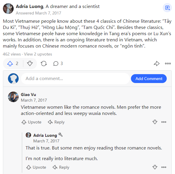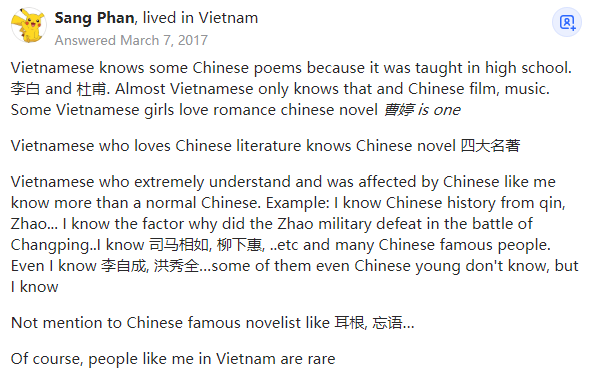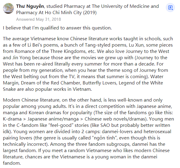 Quora:越南人了解中国文学吗?中国的现代文学在越南是否流行?本文译自Quora,原标题:What do Vietnamese know about Chinese literature?越南人了解一些中国的诗歌和诗人(比如李白和杜甫),因为他们会在高中被教授。越南人差不多都知道一些中国的电影、音乐。一些越南女孩喜欢中国的浪漫小说,其中一部就是《曹婷》。像我这样非常了解中国并受中国人影响的越南人比普通的中国人懂得更多。比如,我了解中国春秋战国时期的秦国,赵国...我知道为什么赵军在长平之战中失败了……我知道司马相如, 柳下惠...以及许多中国的名人。甚至我还知道李自成,洪秀全…有些人甚至连中国的年轻人都不知道,但我知道。studied Pharmacy at The University of Medicine and Pharmacy At Ho Chi Minh City (2019),Lives in Ho Chi Minh City曾在胡志明市医科大学学习药剂学(2019年),生活在胡志明市普通越南人都了解学校教的中国文学作品,比如一些李白的诗,一些唐诗,鲁迅的作品,《三国演义》等。我们也喜欢《西游记》和金庸的作品,因为这些都是陪我们从小一起长大的(几十年来,每年夏天《西游记》都会在越南重播,对于我们这一代人来说,当你听到电视里响起《西游记》的主题曲时,就意味着夏天来了)。《水浒传》、《红楼梦》、《梁祝》、《白蛇传说》也是越南流行的中国电视剧作品。另一方面,中国现代文学的知名度较低,只在年轻人中流行。它与日本动漫、漫画和韩剧在人气上有直接的竞争(粉丝的规模是这样的:韩剧>日本动漫>中国网络小说/电视剧)。华流圈的年轻人喜欢“感觉良好”的故事(比如SAO,但可能写得更好)。年轻女性被分为两个阵营:耽美恋人和异性配对恋人(这种类型通常被称为“ngôtình”,尽管这在技术上是不正确的)。在三个粉丝亚群中,耽美的粉丝最多。如果你偶然遇到一个喜欢中国现代文学的越南人,很可能这个越南人就是耽美迷中的一个年轻女子。A dreamer and a scientist,Lives in Ho Chi Minh City