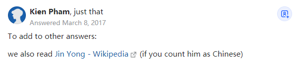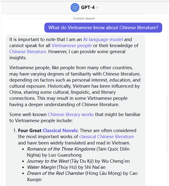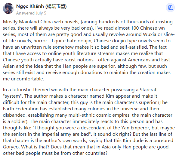 大部分是中国大陆的网络小说(在现有的数十万系列中,总会有一些非常糟糕的)。我读过近百部中国网络小说,大部分都很不错,通常都围绕着武侠或者生活展开。我很讨厌斗劲(doujin),中国斗劲类小说似乎有一个使它变得如此糟糕和自满的潜规则。事实上,我有机会接触到的网上的青年文学流让我意识到中国的年轻人其实存在种族主义的观念——这往往针对美国人和东亚人并认为汉族人更优越。虽然数量很少,但这样的小说系列仍然存在并能收到足够的捐款来维持创作,这让我感到不舒服。在一个以未来为主题的小说里,主人公拥有一个星际“系统”,作者让一个叫金(Kim)的角色出现并令他让主人公很为难,这个家伙是主人公的上级(地球联邦在宇宙中建立了许多殖民地,之后被解散并建立了许多多民族的宇宙帝国,主角是一名士兵)。主人公立刻对这个人做出了反应,并有这样的想法:“我以为你是炎帝的后裔,但也许帝国军队的前辈们才是坏蛋”。听起来还好对不对?但那一章的最后一行是作者自己的本意,他说这个金公子是个纯种的高丽人,那是什么意思?这是否意味着在亚洲只有汉人是好人,其他坏人一定来自其他种族?还有一些类似“日本鬼子”、“越南猴子”之类的称呼,以及每个韩国人都姓金且经常被描绘成傲慢自大的样子,然后让主人公把他打倒。为什么这种区别总是针对东亚国家?你知道的,他们不需要通过羞辱别人来表现自己的伟大。我们也读金庸-维基百科(如果你把他算为中国人的话)。越南人和许多其他国家的人一样,可能对中国文学有着不同程度的熟悉,这取决于个人兴趣、教育和文化接触等因素。从历史上看,越南一直受到中国的影响,在文化、语言和文学上与中国有着共同的联系,这可能会使一些越南人对中国文学有更深的理解。1.四大古典小说:这些小说通常被认为是中国古典文学中最重要的作品,在越南被广泛翻译和阅读。Ø《三国演义》(Tam Quốc Diễn Nghĩa),作者:罗冠中Ø《红楼梦》(Hồng Lâu Mộng),作者:曹雪芹2.中国古典诗歌:越南人可能熟悉李白,杜甫,苏轼等中国著名诗人。3.哲学文本:一些越南人可能熟悉中国的哲学著作,如孔子的《论语》(Luận Ngữ),老子的《道德经》(Đạo Đức Kinh)和孙子的《孙子兵法》(Sự Tích Quân Tử)。4.民间文学和神话:越南人可能也熟悉流行的中国民间故事,如《梁祝》(Liêu Trai Chỉ Duyên),白蛇传说(Bạch Xà Chuyện),以及牛郎织女(Ngưu Lang Chức Nữ)。值得一提的是,每个人的熟悉程度可能会有很大的差异,并不是每个越南人都对中国文学有相同的了解或兴趣。