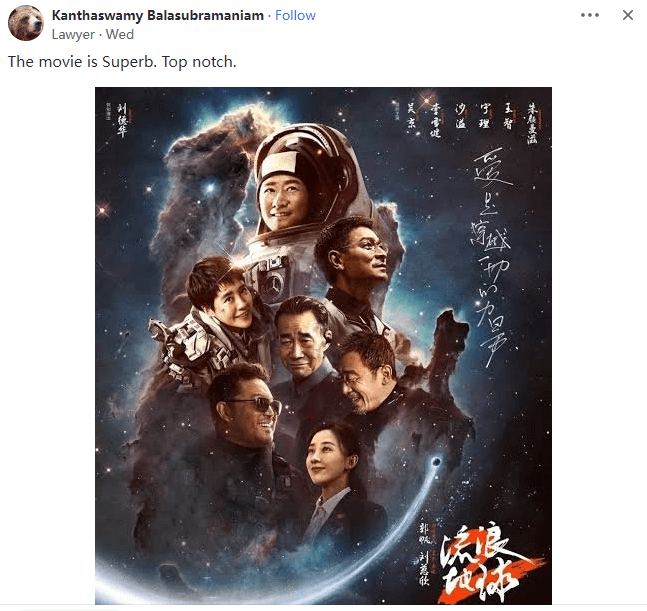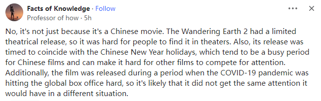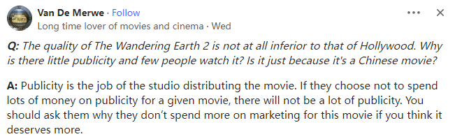 来源:https://www.quora.com/The-quality-of-The-Wandering-Earth-2-is-not-at-all-inferior-to-that-of-Hollywood-Why-is-there-little-publicity-and-few-people-watch-it-Is-it-just-because-its-a-Chinese-movie