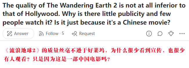 《流浪地球2》的质量丝毫不逊于好莱坞,为什么在国外很少有宣传,是因为这是一部中国电影吗?本文译自Quora,原标题:The quality of The Wandering Earth 2 is not at all inferior to that of Hollywood. Why is there little publicity and few people watch it? Is it just because it's a Chinese movie?Lives in Nanchang, Jiangxi, China (1997–present)