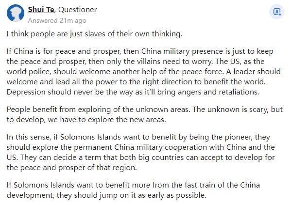 如果中国是为了和平与繁荣,那么中国的军事存在就只是为了维持和平与繁荣,这样的话只有坏人才需要担心。作为世界警察,美国应该欢迎和平力量的又一次帮助。一位领导人应该欢迎并带领所有力量走向正确的方向以造福世界。打压永远不应该成为一种方式,因为它会带来愤怒和报复。人类受益于对未知领域的探索。未知是可怕的,但要发展,我们必须探索新的领域。从这个意义上说,所罗门群岛要想成为先驱者而受益,就应该探索与中美两国永久性的军事合作。他们可以拿出一个两个大国都可以接受的条件,以促进该地区的和平与繁荣。所罗门群岛如果想从中国的发展中获得更多利益,就应该尽早搭上中国这列快车。作为一个贫穷的国家,作为第一批尝试的人,你有什么可失去的?如果交易创造了财富,联系和沟通创造了交易,那么各国应该努力实现这一点,而不是因为恐惧或更糟的是相互争斗而停止这样做。如果中国出于和平目的在那里建立永久军事存在,我真的很想看到美国的反应。在我看来,我认为所罗门群岛政府如果真的想迅速繁荣起来,就应该更大胆一些,也许他们可以通过谈判提议以一个自|治|地区的身份加入中华人民共和国。当穷国与富国合并时,穷国肯定受益更多。美国肯定不会合并所罗门群岛,它甚至不情愿合并波多黎各。加入另一个国家只会让他们的联系和沟通变得更加紧密,因此他们会达成更多的交易,因此他们会迅速繁荣起来。美国政府太聪明了,它们不会合并任何穷国。另一方面,中国仍处于发展阶段,它可能会热衷于将穷国与一种愚蠢乐观的心态融合在一起。曾经有一位智者说过“保持饥饿,保持愚蠢”(译注:stay foolish stay hungry,这是苹果公司创始人Steve Jobs在斯坦福大学毕业典礼上致辞中的最后一句话,也是整个演讲的核心,可以理解为“如饥似渴,抱朴守拙”),我期待着中国保持这种状态。