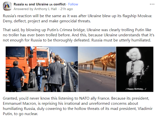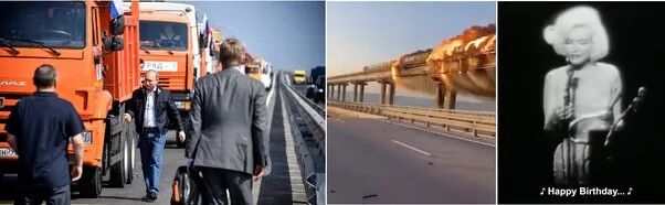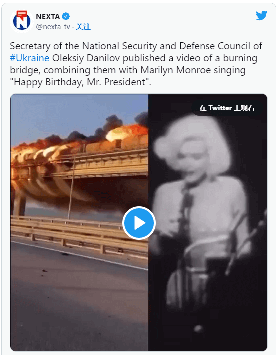 然而,实际上,这就是马克龙在俄罗斯继续对乌克兰进行种族灭绝战争时提出的维希疯狂(Vichy madness)!多么可耻(Quel dommage)!译注:Vichy,即维希法国(法语:Régime de Vichy),正式名称为法兰西国(法语:État français),是二战期间在德国攻入法国并迫使法国投降后,扶持法国政府要员组建的政府,存在于1940年7月到1945年间。请注意,我认为羞辱普京将是结束其侵略的唯一途径,即使在其于2月24日发动种族灭绝入侵之前。因为我在1月22日《经济学人》关于普京在乌克兰边境集结军队的一篇报告的评论部分中写道:“俄罗斯的恐吓欺凌者弗拉基米尔·普京和朝鲜的恐吓欺凌者金正恩是一路货色……只是他拥有大量的石油和更多的核武器来操作他的恶作剧。唉,我们没有办法阻止他入侵乌克兰。北约只能帮助乌克兰羞辱他并让他退却。但我担心只有在战场上一次次的失败——导致成百上千的俄罗斯人带着尸袋回家——才能做到这一点。”也就是说,很明显在乌克兰没有人会注意到马克龙说的任何话,只有这样才能解释为什么乌克兰人会像总统沃洛德米尔·泽伦斯基的国家安全顾问一样羞辱普京。为此,他发布了一段玛丽莲梦露演唱她标志性的“总统先生生日快乐”的视频,旁边是普京珍贵的连接克里米亚和俄罗斯的桥梁被炸毁的画面。当然,这场恶作剧的关键是指责俄罗斯人(眨眼一笑)炸毁了他们自己的桥梁;你知道的,从炸毁自己的医院和学校到炮轰自己的核计划,俄罗斯人一直在指责乌克兰人。首先是俄罗斯的军舰,去你妈的吧。现在是俄罗斯的克里米亚大桥,去你妈的吧!