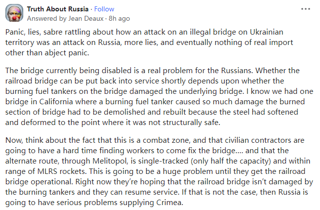 恐慌,谎言,袭击乌克兰领土上的一座非法桥梁怎么是对俄罗斯的袭击呢?更多的谎言,最终除了可悲的恐慌之外没有任何真正重要的东西。这座桥梁目前正在被禁用,这对俄罗斯人来说是一个真正的难题。铁路桥能否很快恢复使用取决于桥上燃烧的油罐车是否损坏了下面的桥梁。我知道在加州有一座桥,一辆燃烧着的油罐车曾在那里造成了如此严重的损坏,以至于桥梁被烧毁的部分不得不拆除和重建,因为里面的钢材已经软化和变形到了结构不安全的程度。现在,考虑到这是一个战区,民用承包商将很难找到工人来修桥…另外,通往梅利托波尔(Melitopol)的备用路线是单轨(只有容量的一半),它在多管火箭炮(MLRS)的射程范围内。在铁路桥投入运营之前,这将是一个巨大的问题。现在,他们希望铁路桥不会被燃烧的油轮损坏,这样的话他们还可以恢复运营。如果情况并非如此,那么俄罗斯在供应克里米亚方面将面临严重的问题。