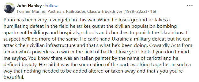Former Marine, Postman, Railroader, Class a Truckdriver (1979–2022),Lives in The United States of America1958–present前海军陆战队队员、邮递员、铁路员工、A级卡车司机(1979年至2022年),1958年至今生活在美国普京在这场战争中的报复心很强。当他在战场上失利或遭遇耻辱性的失败时,他会轰炸平民公寓、医院、学校和教堂以惩罚乌克兰人,这次我想他会做更多同样的事情。他无法给乌克兰带来军事上的失败,但他可以攻击他们的民用基础设施,这就是他一直在做的。这是一个在战场上无能为力的人的懦弱行为。