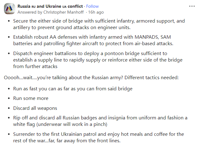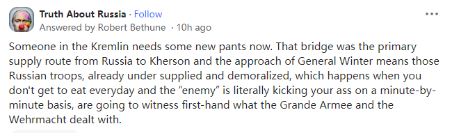 克里姆林宫的人现在需要一些新的胡说八道。这座桥是从俄罗斯到赫尔松的主要补给线,冬将军(General Winter)的到来意味着那些俄罗斯军队已经供应不足、士气低落,当他们每天都吃不到东西,而“敌人”真的在时刻踢他们的屁股时,他们将亲眼目睹“大军团”(译注:Grande Armee,即拿破仑远征俄罗斯所率大军的名字)和“国防军”(译注:the Wehrmacht,即纳粹德国国防军)所经历的事情。这些不是孤立的事件,这些都是“游戏计划”的一部分。除非你有坚定的获胜计划,否则决定与俄罗斯作战是毫无意义的。除非有一个坚实的让乌克兰获胜的计划,否则用价值数十亿美元的武器支持乌克兰是没有意义的。