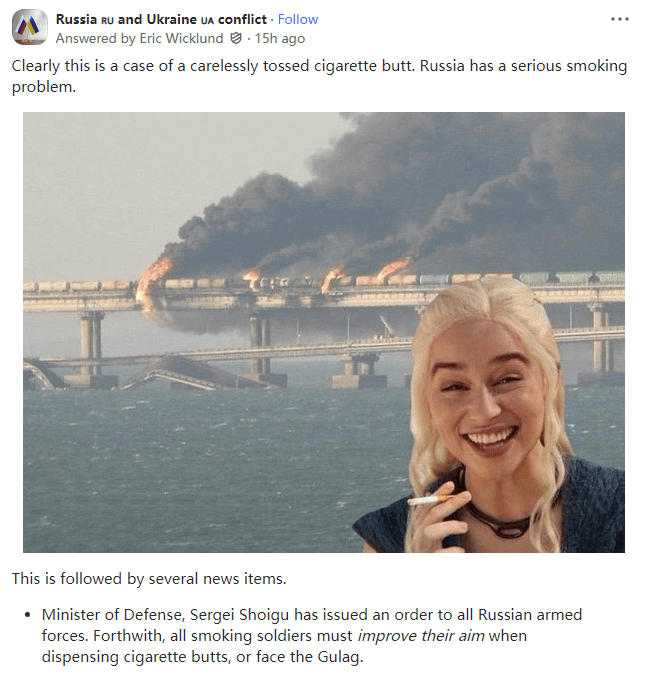 来源:https://www.quora.com/What-will-Russias-reaction-be-after-the-Crimea-bridge-explosion
