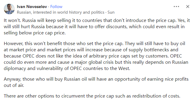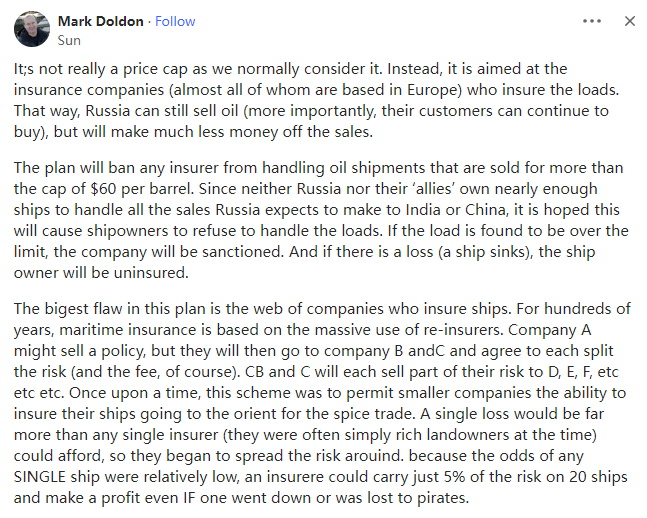 这不是我们通常认为的真正的价格上限。相反,它针对的是为货物投保的保险公司(几乎所有的保险公司都设在欧洲)。这样的话,虽然俄罗斯仍然可以出售石油(更重要的是,他们的客户可以继续购买),但从销售中赚的钱要少得多。