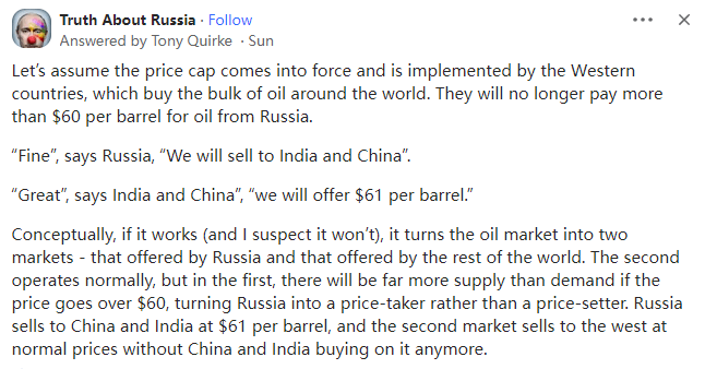 从概念上讲,如果它奏效(我怀疑不会),它将把世界石油市场一分为二——俄罗斯供应的市场和世界其他国家供应的市场。第二个市场运作正常,但在第一个市场下,如果价格超过60美元,其供应量将远远超过需求量,俄罗斯将成为价格的接受者而不是价格的制定者。如果俄罗斯以每桶61美元的价格向中国和印度出售石油,第二个市场以正常价格向西方出售,那么中国和印度将不再购买。