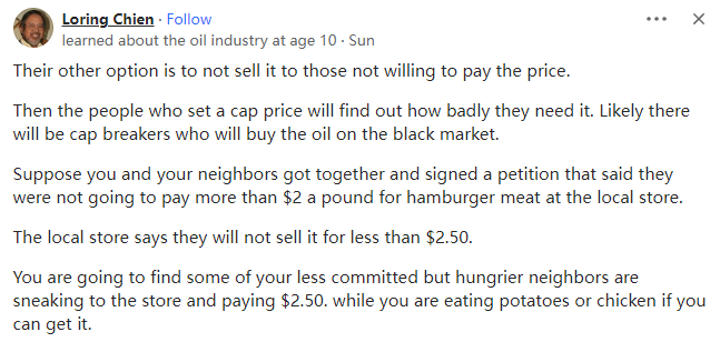 这样的话,那些设定价格上限的人会发现他们有多么迫切地需要石油,很可能会有人打破上限并在黑市上购买。
