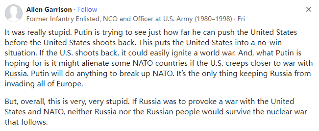 普特勒(Putler)的米格战机不是也在“敏感区域”吗?除此之外,它不也在造成“事故”或“误判”吗?为什么只关注美国人而不关注普特勒(Putler)呢?
