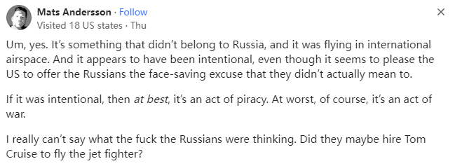 我只是指出当我听说这件事时我最初的想法,这并不意味着我支持普京。我们都知道无人机的用途,所以毫不奇怪,它以前曾引起过俄罗斯的注意并最终导致了事故的发生。我确实认为就碰撞而言这是一起事故,因为我认为飞行员不会冒着价值 3500 万美元的飞机和他自己甚至更有价值的生命的风险去故意进行一点“受控的碰撞”,那将是非常愚蠢的。