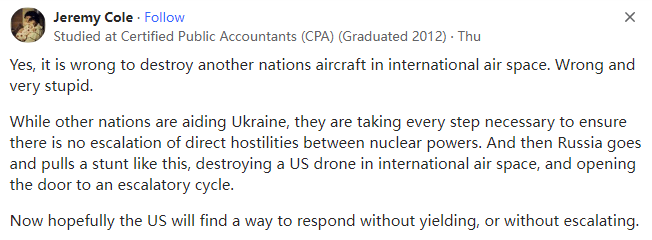 其他国家在援助乌克兰的同时都在采取一切必要的措施确保核大国之间的直接敌对行动不会升级,但俄罗斯采取了这样的愚蠢行为,在国际空域摧毁了一架美国的无人机并为局势的升级循环打开了大门。