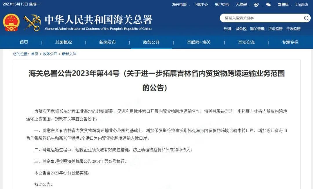 根据海关总署发布的2023年第44号(关于进一步拓展吉林省内贸货物跨境运输业务范围的公告),2023年6月1日起,在原有吉林省内贸货物跨境运输业务范围的基础上,增加俄罗斯符拉迪沃斯托克港为内贸货物跨境运输中转口岸,增加浙江省舟山甬舟集装箱码头和嘉兴乍浦港2个港口为内贸货物跨境运输入境口岸。