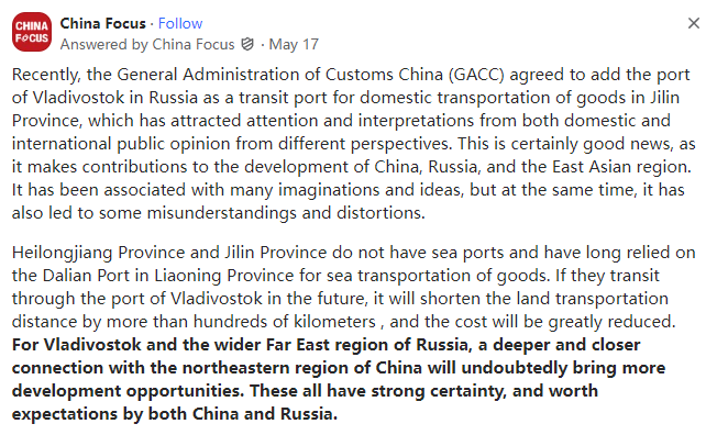 本文译自Quora,原标题:China approves Vladivostok in Russia's Far East as a cross-border transit port for domestic trade shipment in Northeast China’s Jilin Province, effective from June. What will be the impact?