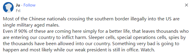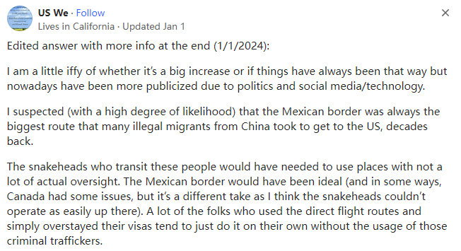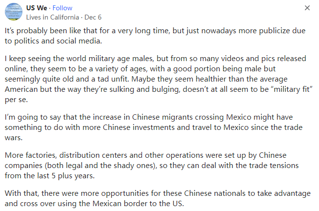这种情况可能由来已久,只是如今由于政治和社交媒体的影响而更加公开化了。我经常看到世界上服兵役的男性,但从网上发布的许多视频和照片来看,他们的年龄似乎各不相同,有相当一部分是男性,但似乎相当老,而且有点不健壮。也许他们看起来比普通的美国人更健康,但他们闷闷不乐、膀大腰圆的样子似乎一点也不“适合当兵”。我想说的是穿越墨西哥的中国移民的增加可能与贸易战以来中国在墨西哥的投资和旅行增多有关。中国公司(包括合法公司和黑心公司)建立了更多的工厂、分销中心和其他业务,这样他们就可以应对过去五年多来的贸易紧张局势。这样一来,这些中国人就有更多机会利用墨西哥边境进入美国。贫穷和绝望的人总是无处不在,即使在富裕或越来越富裕的国家也是如此。此外,逃离麻烦的人可能与当局或犯罪组织有矛盾,也可能两者兼而有之。所有关于这种情况的阴谋论(尤其是关于秘密“入侵”的阴谋论)都应该用批判的眼光来看待,而这种情况比比皆是。非法越过南部边境进入美国的大多数中国公民都是单身的男性军人。即使这些人中有90%只是为了更好的生活而来,但仍有成千上万的人进入我国是为了造成伤害。成千上万的潜伏小组、特别行动小组和间谍被允许进入我们的国家。非常糟糕的事情即将发生,而且很可能是在我们软弱的总统还在任的时候。走着瞧。我有点怀疑这是否是一个大的增长,或者事情是否一直都是这样,只是如今由于政治和社交媒体/技术的原因而更加公开化了。我怀疑(可能性很大)早在几十年前,墨西哥边境就一直是许多来自中国的非法移民前往美国的最大路线。转运这些人的蛇头需要使用没有太多实际监督的地方,而墨西哥边境就是理想的选择(从某些方面来说,加拿大也存在一些问题,但这是一个不同的观点,因为我认为蛇头在那里不容易行动)。很多使用直飞航线、签证逾期不归的人往往会自己处理,而不会借助那些犯罪贩子。1.经济原因--只是想为自己或家人争取更好的机会,但又无法通过正当途径......或者他们根本无法在中国的快速发展中参与竞争,因而落在了后面。2.逃避麻烦--与当局或犯罪团伙发生纠纷,需要尽可能逃离。我一直在阅读和聆听有关这一主题的更多信息,包括英文和中文资料。从这些中国移民的言谈举止、年龄和衣着打扮来看,他们似乎是过得还不错的类型(也许不是很好的类型,但在教育程度和之前拥有的财富方面处于中等水平)。我认为促使他们中的很多人走上这条路的原因可能是随着中国经济的变化,尤其是房地产领域的大量重组,他们失去了一大笔钱。其中一些人可能会被美国轻松的信贷和物有所值的生活方式所吸引并认为他们可以利用自己的知识和经验来重新开始。他们中的一些人可能会把政治压迫作为移民的借口,这在技术上是正确的,但可能与我们西方人的理解不同。取决于这些中国新移民能否留在美国,他们可能成为美国的资产,也可能成为美国的负担。在没有看到他们在美国一段时间的表现之前,还很难说。如果他们的态度与许多其他中国大陆移民一样,他们可能会适应并有所作为,只是偶尔会在这里或那里制造一些麻烦。我不相信中供利用这些潜在的潜伏特工从内部扰乱美国的阴谋论。如果我关于他们因财产经济损失而移民的理论属实的话,至少他们中的大多数人不会。不过我会在理论中加入一点,即接受每波移民中都可能有一两个间谍的可能性,因为这样的机会太好了,不能不好好利用。虽然说了这么多,但我认为我们还是要小心对待这些新移民。这些人有可能比其他中国移民潮更有政治背景。考虑到许多移民的年龄范围,从表面上看,他们很可能是中国经济腐败泛滥时期的一员。为了生存和发展,他们可能别无选择,只能参与其中。因此,这些新移民中的一些人可能与家乡的中国政府有敏感问题,如果中国希望他们(或者可能是特定的个人而不是整个群体)回国,这可能会导致外交问题。对于任何移民群体来说,这都是一种冒险,但这是美国政府需要真正认真对待的事情,在做出决定之前要考虑到所有情况。