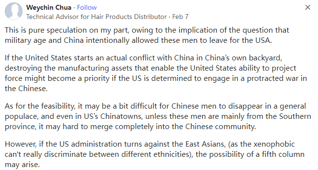 然而,如果美国政府转而反对东亚人(因为排外主义者无法真正区分不同种族),那么第五纵队的可能性就会出现。