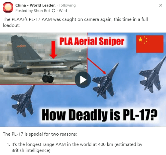 网文来自网友原文翻译投稿,所有言论皆不代表本站立场 | 本文文字/图片来自网络,侵删 | 点击页眉也可刷新 | 注册送50花瓣,每日登录送5花瓣 | 本文内容仅供娱乐,不作任何严肃之用途中国空军超远程空空导弹PL-17曝光,与美国和俄罗斯的空空导弹相比有什么优势?本文译自Quora,来自China - World Leader频道。近期,《军网》发布的一组歼-16战机携带多枚导弹飞行的画面吸引了军迷的关注,因为有眼尖的军迷发现,这一次歼-16机翼下面似乎出现了一枚新的“超长导弹”,这枚导弹被外界认为就是传说中的PL-17导弹,有消息称,这是射程可以达到400公里的超远程空空导弹,可以在现代空战环境中发挥超视距作战方面的巨大优势。在公开的画面中,可以看到有4架歼-16一起列队飞行,这4架歼-16的载荷并不一样,其中左边的两架载荷更大,以“导弹卡车”的模式亮相,战机携带了10枚空空导弹,PL-17就在左边机翼的靠内位置。仅仅对比照片,就能发现PL-17的体型远远要比其他PL-15等型号大,这明显是为了满足远距离巡航的需要。疑似PL-17的亮相也受到外媒的关注,因为这种新型导弹的射程很远,可以说是当前全世界能够达到最远距离的空空导弹。事实上,PL-15的射程就已经足够远了,能够达到200公里以上,而这超过了美国的AIM-120空空导弹,AIM-120拥有A、B、C、D四个版本,但即使是射程最远的D版本,也仅有大约180公里的射程距离,可以说,在空对空导弹的射程上,中国已经遥遥领先美国。