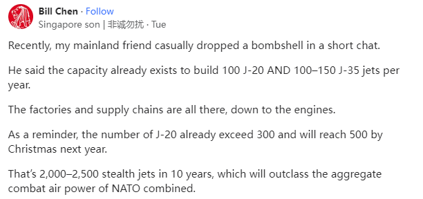 中国拥有年产100架歼-20,100-150架歼-35的能力?10年内中国将有2000至2500架隐形战机并超过北约空军战斗力的总和?本文译自Quora,原地址:https://www.quora.com/profile/Bill-Chen-140Singapore son | 非诚勿扰,Lives in Singapore最近,我的大陆朋友在一次简短的聊天中无意间抛出了一个重磅炸弹。他说,中国已经具备了每年生产100架歼-20和100-150架歼-35战斗机的能力。提醒一下,歼-20的数量已经超过300架,到明年圣诞节将达到500架。也就是说,10年内中国将有2000至2500架隐形战机,这将超过北约空军战斗力的总和。不要惊讶于美国大大低估了中国拥有的武器的数量和质量。这也许是一个故意的做法。中国人不喜欢自吹自擂,而是喜欢隐藏自己的真实实力,尤其是对那些敌视中国的人。洛克希德·马丁公司声称其F-35的最大生产能力已达到每年156架[1]。[1]五角大楼宣布F-35全面投产,比原定计划落后数年但他们缺乏双引擎的空优战斗机平台,其导弹的射程和传感器的探测范围也不如歼-20。歼-35也有一些有趣的绝招。去年,由于雷达和航电设备的制造问题,F-35的生产速度有所放缓(*眨眼*)。小道消息称,洛克希德·马丁公司和其他公司正与民用制造商接洽,希望它们帮助从中国采购这些设备,但它们遇到了麻烦。中国不需要它来打败美国、北约、日本、韩国、澳大利亚和印度。你可以每年生产1万架战机,但问题的关键是你能在热战中每年培养1万名飞行员吗?无论幸运与否,中国都是民用/军用无人机的主要制造商。没错,人的生命是宝贵的,但由于人口基数较大,中国培训一名新飞行员的成本相对较低。这都是数字的问题,14亿对3亿。中国已经拥有数千架战机,将战机升级到21世纪的水平不成问题。新加坡经常被指责为美国的又一个附庸,这完全是胡说八道。新加坡人认为他们别无选择,只能让美国人在新加坡建立军事存在,但东盟其他国家和中国却不这么认为。我相信我们是根据当时的情况做出的选择。情况改变,选择也会改变。新加坡将尽力说服中国和美国,它们并不反华,但如果迫不得已,它们会在时机成熟时这样做。因为大多数人都不知道Pakul Habis和麦克唐纳炸房事件(Pakul Habis and McDonald house bombing)。一个来自北方的邻居,另一个来自南方。当你有好邻居时,谁还需要朋友?如果你们是美国军事基地的东道国,不断配合美国的要求和制裁,提供信息和后勤支持以及各种形式的援助,那么其他人就有充分理由认为你们是美国的附庸。作为印-太地区军事实力最强大的国家,如果新加坡被“要求”执行某些任务/差事,它是否会服从?我认为中国ZF拥有这种能力,但在需要时才建造是非常明智的。正如所有在美国的人都能看到的那样,只有当你想杀人或想恐吓他人时,你才会制造和使用武器。如果你身边有一把昂贵的枪,你迟早你会想用它。第二批生产的歼-20很可能已经是第一批歼-20的增强型/改进型,如此循环往复。在后续批次生产时,它们也会对早期批次进行升级,至少发动机就是这样。