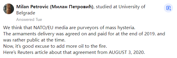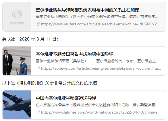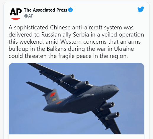 这与购买武器的任何其他国家有什么不同?……这里唯一的问题似乎是,我们是从中国而不是美国购买武器,但这是因为我们与中国签订了双边协议,所以我看不出这是塞尔维亚-北约战争的预兆。如果是美国出口武器呢?或者下面的新闻呢?没事,因为飞机来自法国…有些人是不是有太多妄想症了���?