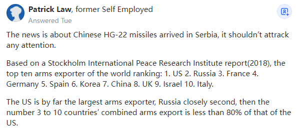 新闻是关于中国HQ-22导弹抵达塞尔维亚的,这不应该引起任何关注。因为根据斯德哥尔摩国际和平研究所(Stockholm International Peace Research Institute,2018)的一份报告,世界十大武器出口国排名为:1.美国 2.俄罗斯 3.法国 4.德国 5.西班牙 6.韩国 7.中国 8.英国 9.以色列 10.意大利到目前为止,美国是世界上最大的武器出口国,俄罗斯紧随其后,排名第三到第十的国家的武器出口总额加起来还不到美国的80%。