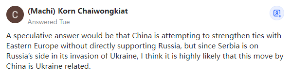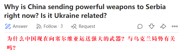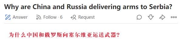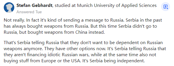 不尽然。事实上,这是在向俄罗斯传递信息。塞尔维亚过去一直从俄罗斯购买武器,但这次塞尔维亚没有找俄罗斯,而是从中国购买了武器。这是塞尔维亚在告诉俄罗斯,他们不想再依赖俄罗斯的武器了,他们现在有其他选择。这是塞尔维亚在告诉俄罗斯,他们不会资助俄罗斯发动的愚蠢的战争,同时也不会从欧洲或美国购买武器。塞尔维亚是独立的国家。(Machi) Korn Chaiwongkiat一个推测性的答案是,中国试图在不直接支持俄罗斯的情况下加强与东欧的关系,但由于塞尔维亚在入侵乌克兰时站在俄罗斯一边,我认为中国的这一举动很可能与乌克兰有关。
