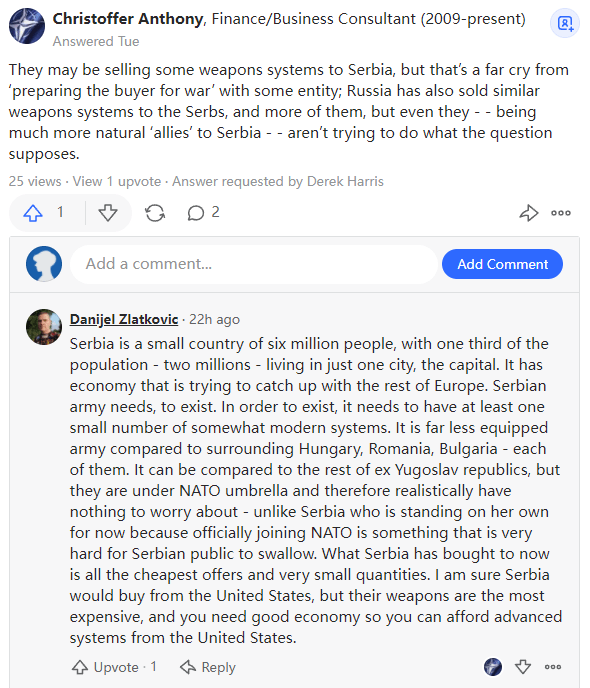 他们可能正在向塞尔维亚出售一些武器系统,但这与“让买方为与某个实体的战争做好准备”相去甚远;俄罗斯也向塞尔维亚人出售了类似的武器系统,而且还出售了更多,但即使是他们——作为塞尔维亚更天然的“盟友”——也没有尝试去做问题所假设的事情。塞尔维亚是一个拥有600万人口的小国,其三分之一的人口——200万人——生活在首都一个城市。它正试图在经济上赶上欧洲其他国家。塞尔维亚军队需要生存,为了生存它需要至少有一小部分现代化装备。与周边的匈牙利、罗马尼亚、保加利亚——几乎每一个国家——相比,它的装备要差得多。我们可以拿它与前南斯拉夫的其他共和国做一下比较,与独立的塞尔维亚不同(因为正式加入北约对塞尔维亚公众来说是很难接受的),那些国家现在处在北约的保护伞下,因此它们在现实中没有什么可担心的。塞尔维亚现在购买的都是报价最便宜的装备,购买的数量也很少。我相信塞尔维亚也会从美国购买武器,但他们的武器太贵了,你需要有良好的经济状况,这样你才能买得起先进的美国武器。