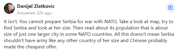 事实并非如此,因为你没办法让塞尔维亚为与北约的战争做好准备。看看地图,试着找到塞尔维亚,看看它的大小,然后看看它的人口,你会发现它大约只有一些北约国家的一个大城市那么大。但所有这些并不意味着塞尔维亚不应该像其他任何其他国家那样拥有军队,而中国可能只是提供了最便宜的报价。